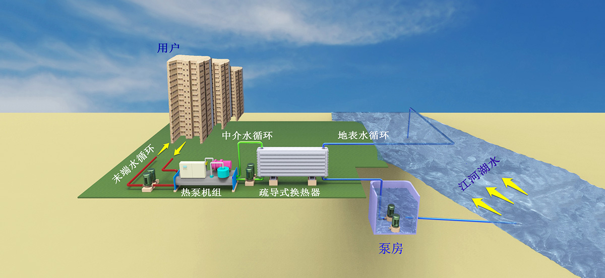 地表水源熱泵系統(tǒng)宏觀上由三個子循環(huán)系統(tǒng)組成,即地表水循環(huán)統(tǒng)、中介水循環(huán)系統(tǒng)、末端水循環(huán)系統(tǒng)。