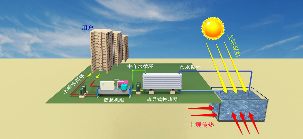 然后,0.5℃左右的清潔水經(jīng)中介泵輸送,在配置合理有效狀態(tài)下進入熱泵機組進行釋熱,將從地表水那里獲取的熱量傳遞給熱泵機組,再以-3.5℃左右再次進
