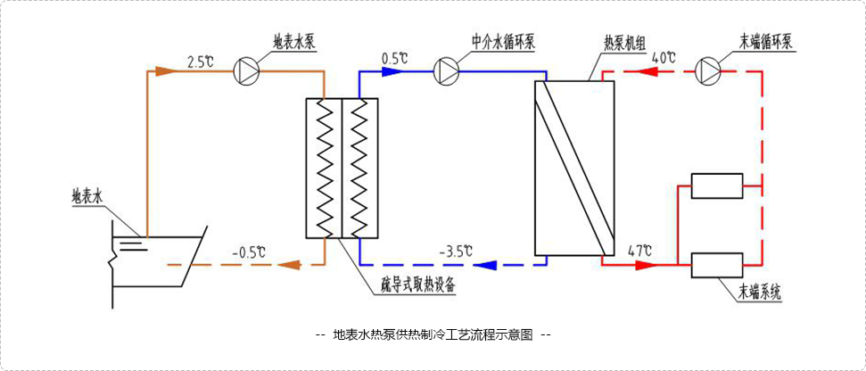 系統(tǒng)的主要設備包括地表水泵、疏導式換熱器、中介水循環(huán)泵、熱泵機組、末端循環(huán)泵。